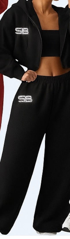The 2-Piece Crop Zip & Slay Bae Casual Set is your go-to fit for effortless style and comfort. This matching set includes a cropped zip-up hoodie with rhinestone SB logo detail and relaxed-fit joggers that flatter every shape. Designed with medium-stretch fabric, it keeps its form while letting you move freely. Perfect for casual wear, errands, or lounging in glam.