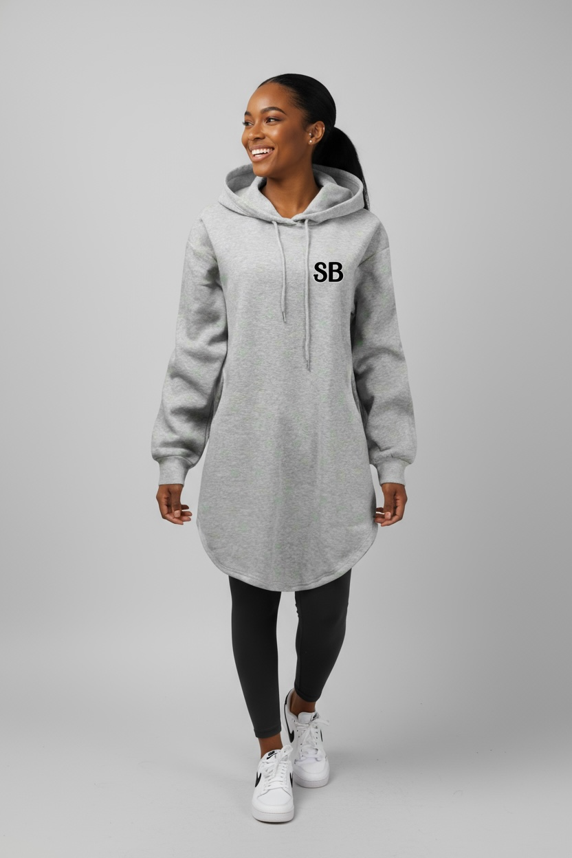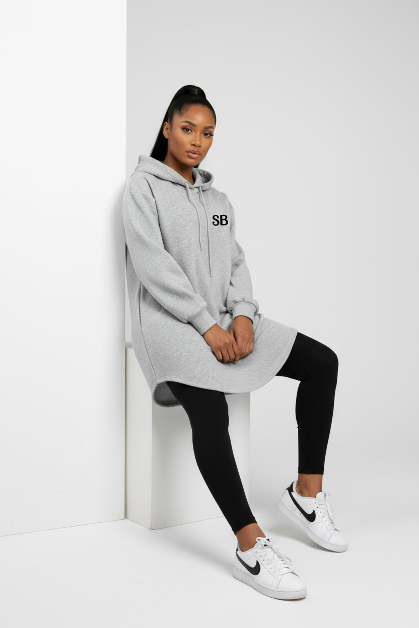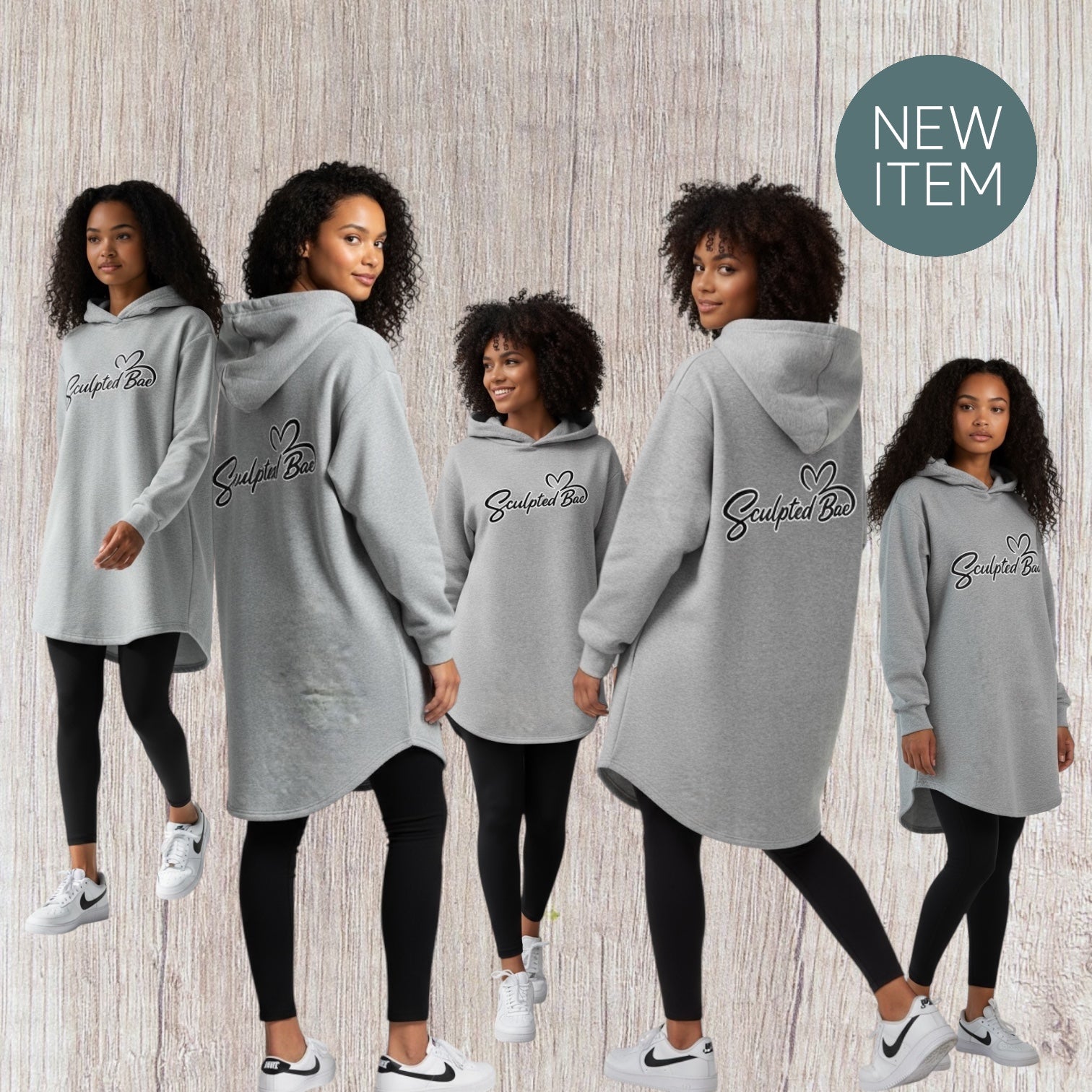 This long hooded sweatshirt brings a soft oversized look with a relaxed shape. The knitted fabric sits light on the body and falls past the hip for full coverage. The hood adds a casual touch for cooler days and the wrist-length sleeves keep a clean fit. The curved hem gives movement and pairs with leggings or joggers for a smooth fall look.