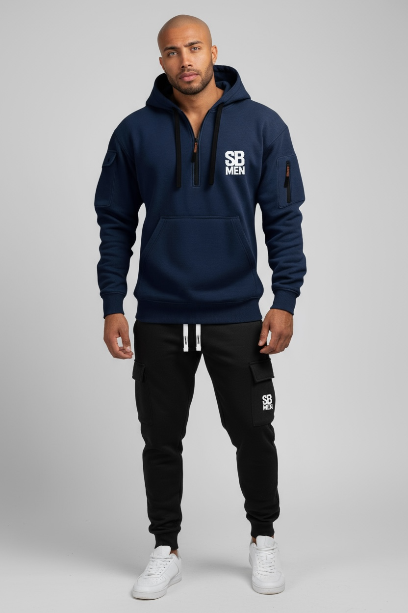 This set delivers a clean, structured fit built for daily wear. The fabric holds shape, stays smooth, and provides steady comfort through the day. The hoodie includes a front pocket, a zip detail on the sleeve, and drawstrings. The sweatpants include a cargo pocket, an elastic waistband, and a tapered leg.